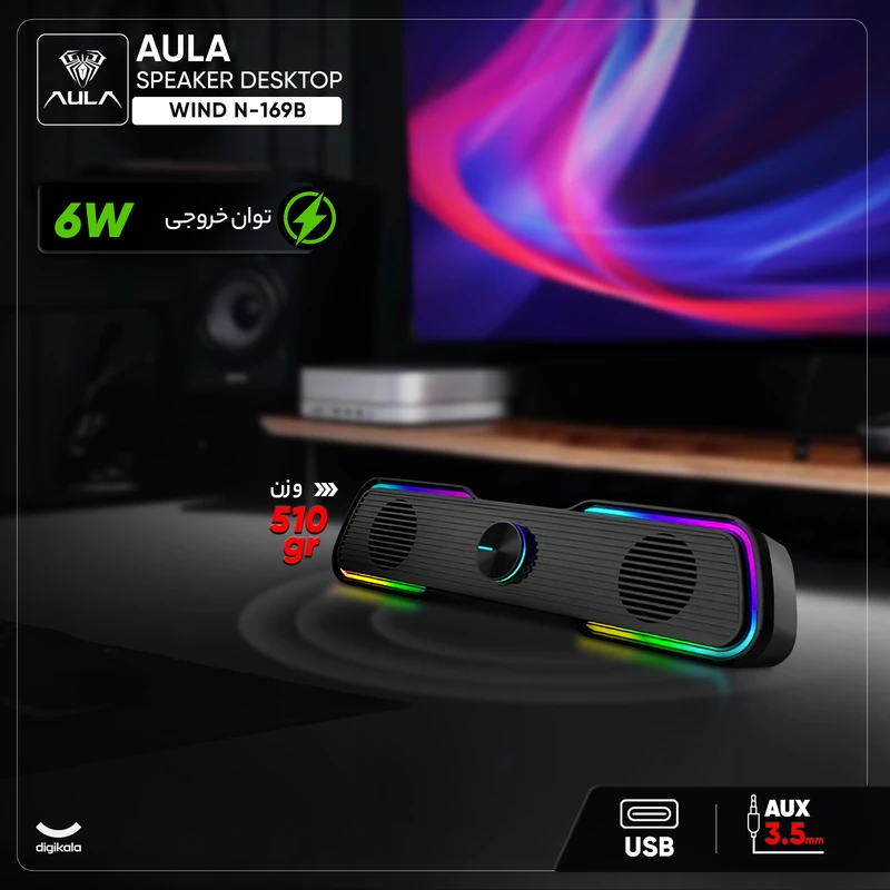 + موارد بیشتراسپیکر «WIND N-169B» ساخته شده توسط شرکت «آئولا» است. این اسپیکر به صورت سیم دار طراحی شده و مناسب برای لپ تاپ و کامپیوتر است. این محصول دارای کابل صدا بوده (جک 3.5 میلی متر) و بوسیله رابط USB تامین انرژی که میتوانید کامپیوتر و یا لپ تاپ خود استفاده کنید. این اسپیکر از قدرت صدای بالایی برخوردار است و بوسیله آن می توان از وضوح صدای موسیقی لذت برد. این اسپیکر با وزن کمی که دارد (حدود 500 گرم) قابل حمل بوده و به راحتی میتوان از آن در هر محل استفاده کرد و از صدای واضح آن لذت برد. حجم صدای آن به گونهای است که به راحتی پاسخگوی نیازهای صوتی مورد نیاز در منزل، مغازه، کافی شاپ و رستورانها، کلاسهای آموزشی و موارد مشابه است. نورهای RGB این اسپیکر زیبایی خاصی دارد و اکثر گیمرها برای چیدمان میز کامپیوتر خود دنبال کننده این نوع اسپیکرها هستند.