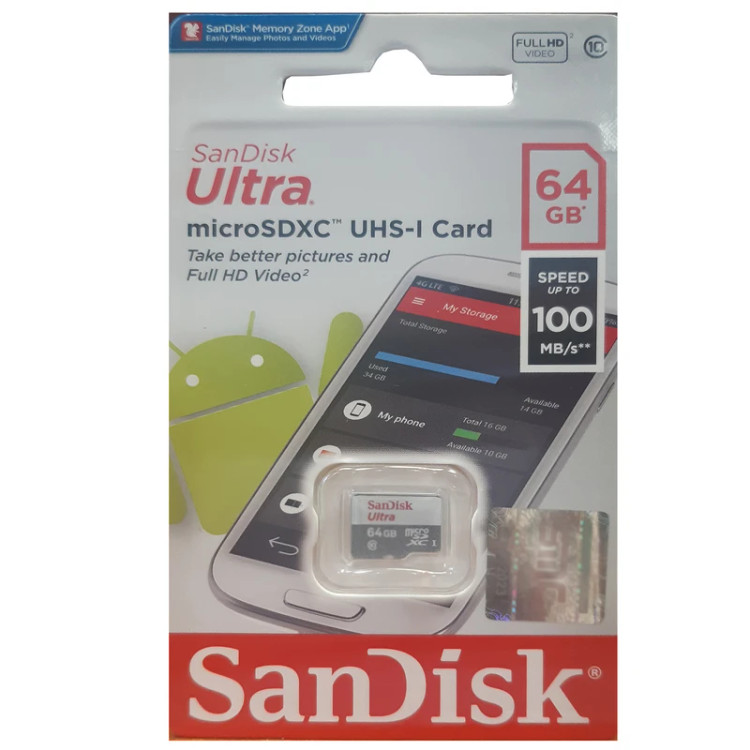 کارت حافظهی 64 گیگابایتی «سندیسک» از کلاس 10 و دارای استاندارد سرعت UHS-I است. نگهداری، تماشا و ثبت فایلهای ویدیویی باکیفیت Full HD، تنها به ظرفیت بالا برای ذخیرهسازی نیاز ندارد؛ بلکه کارت حافظهای که در نظر گرفته میشود، باید سازگاری ویژهای برای این منظور داشته باشد. کارت حافظههای کلاس 10 مناسبترین ابزار برای این کار هستند. کارتهای این رده بدون هیچگونه لگ یا توقف، فرمت Full HD و 3D را پشتیبانی میکنند. سرعت خواندن اطلاعت در این کارت، حداکثر 100 مگابایت بر ثانیه است. این سرعت در محدودهی سرعتهای بالا ردهبندی میشود. این کارت با دستگاههایی که پذیرندهی کارتهای microSDHC و microSDXC هستند، سازگار است. پرتو X، تغییرات دمایی بر عملکرد کارت حافظهی سندیسک تاثیری نداشته و اطلاعات آن آسیبی نمیبیند. محدودهی دمایی برای عملکرد بهینهی این کارتها بین -40 تا +85 درجهی سانتیگراد است.