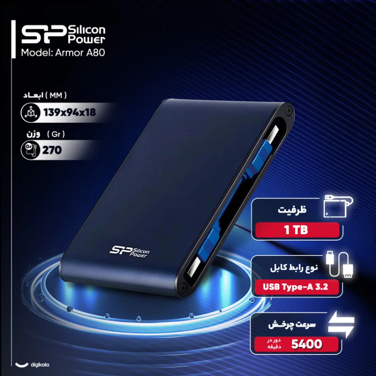 هارد اکسترنال سیلیکون پاور مدل Armor A80 ظرفیت دو ترابایت دارای رابط USB Type-A 3.2، سازگار با گوشی موبایل، تبلت، دوربین، کامپیوتر و لپتاپ (ویندوز و مک)، کنسول بازی، با سرعت چرخش 5400 دور در دقیقه