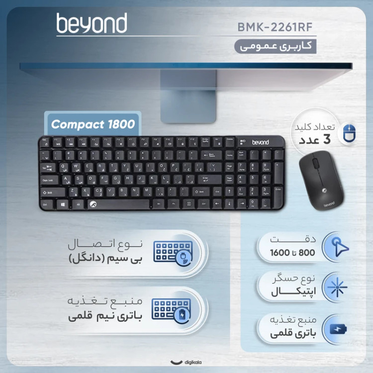 کیبورد و ماوس بی سیم بیاند مدل BMK-2261RF با سوییچ ممبران، Compact 1800، اتصال Plug & Play، حروف حک شده فارسی، پایههای ضد لغزش